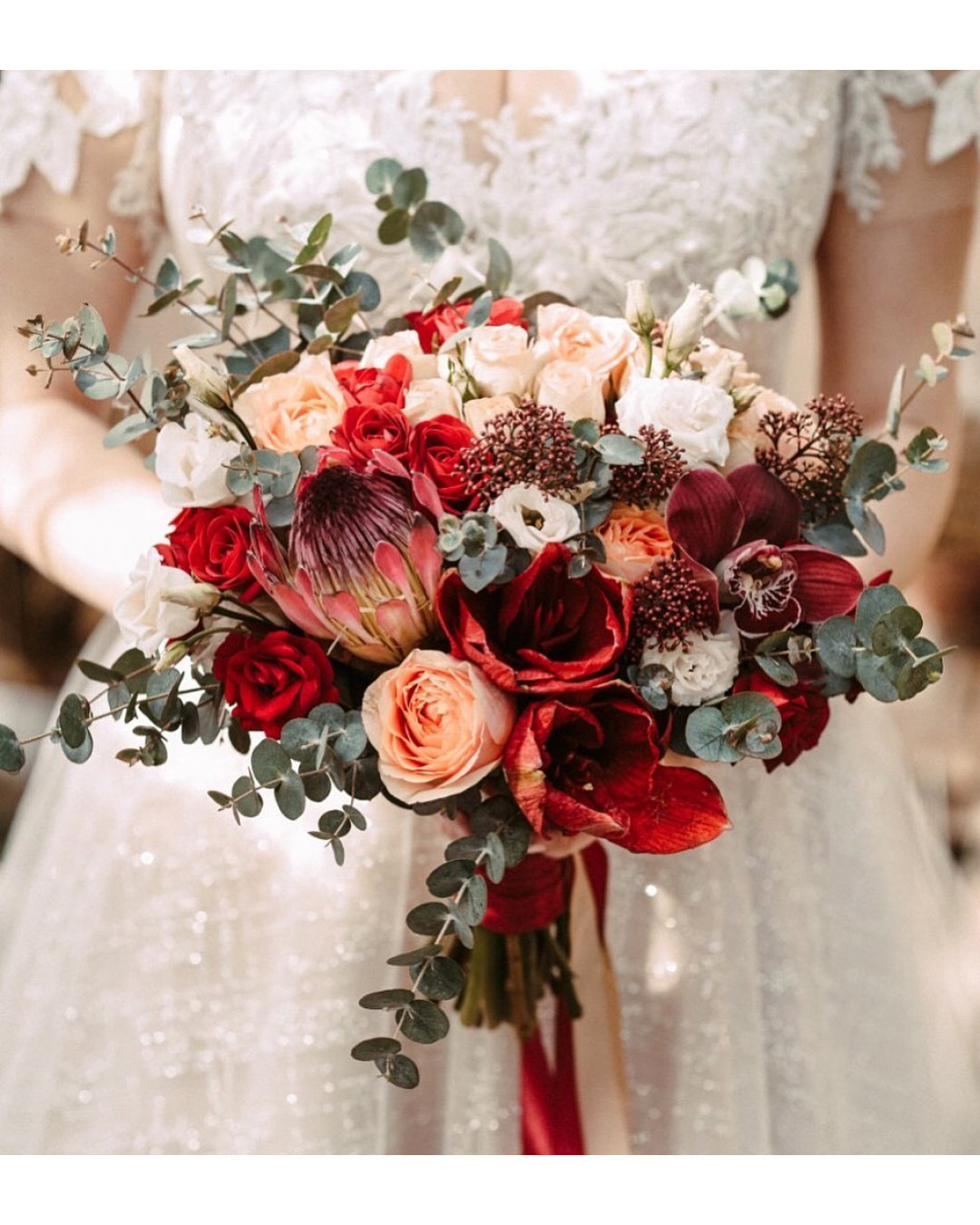Состав: протея, амариллис, роза, скиммия, орхидея, эвкалипт, эустома