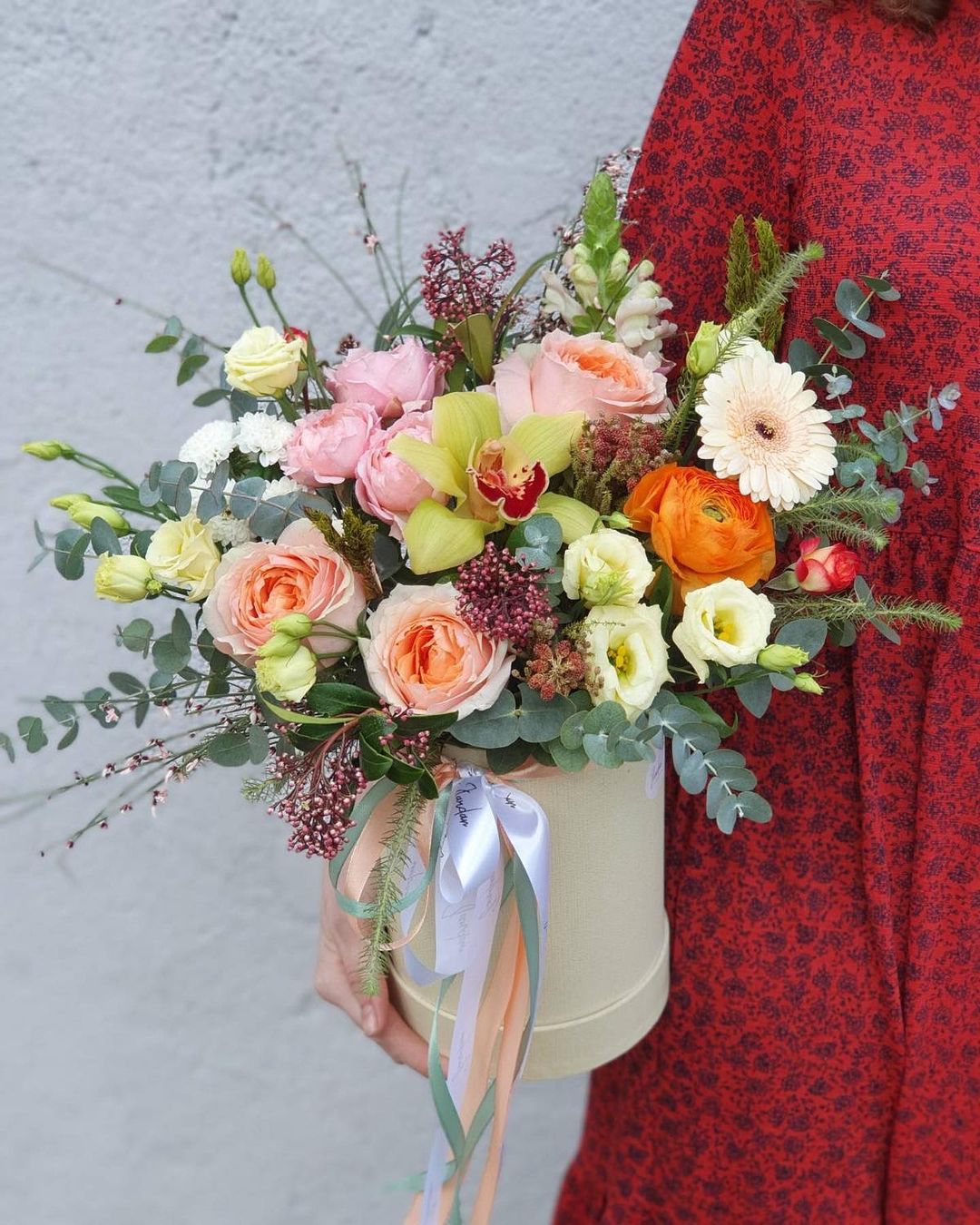 Состав: роза, эустома, орхидея, гербера, роза кустовая, хризантема, скимия, эвкалипт, ранункулюс, гениста, антуриум