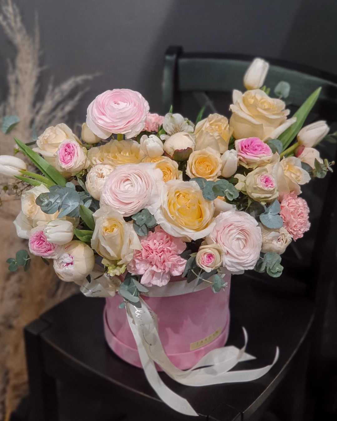 Состав: ранункулюс, роза кустовая, роза, тюльпан, эвкалипт, гвоздика