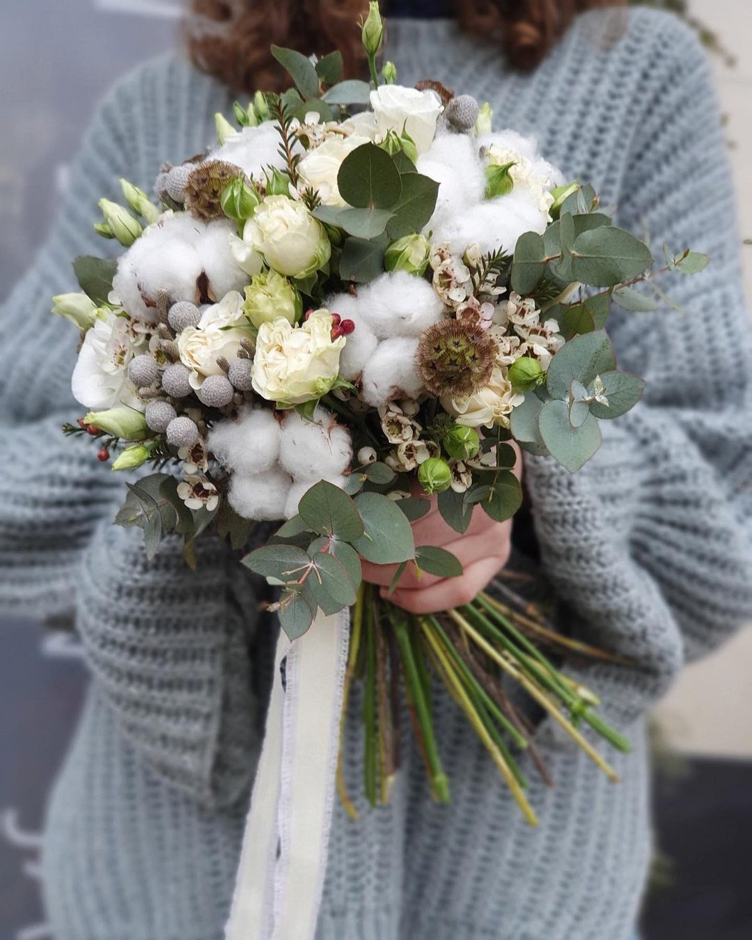 Состав: хлопок, роза кустовая, скабиоза, хамелациум, эустома, эвкалипт