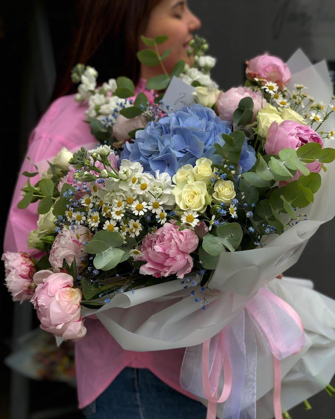Состав:  гортензия, танацетум, пион, роза кустовая, маттиола, гипсофила, эвкалипт