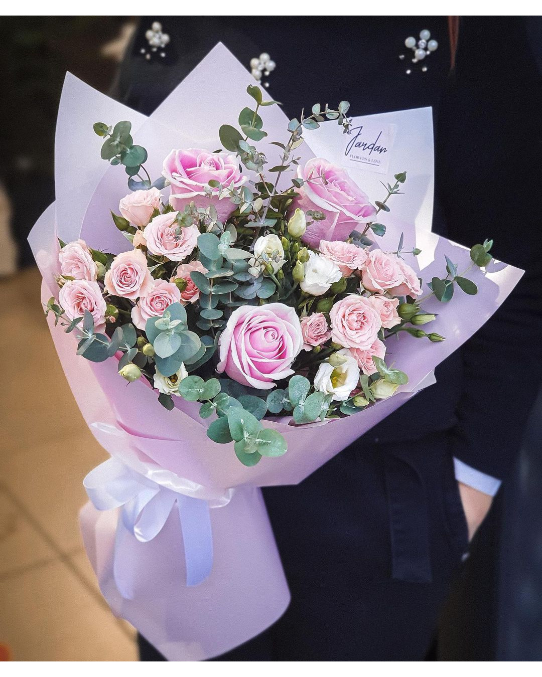 Состав: роза, роза кустовая, эустома, эвкалипт