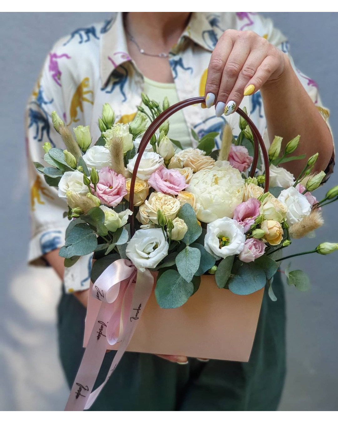 Состав: роза кустовая, эустома, эвкалипт, пион, лагурус